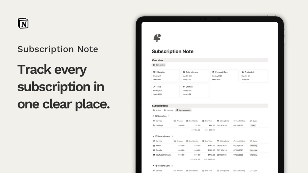 A focused Notion tool that makes every cost clear and every billing date easy to track.